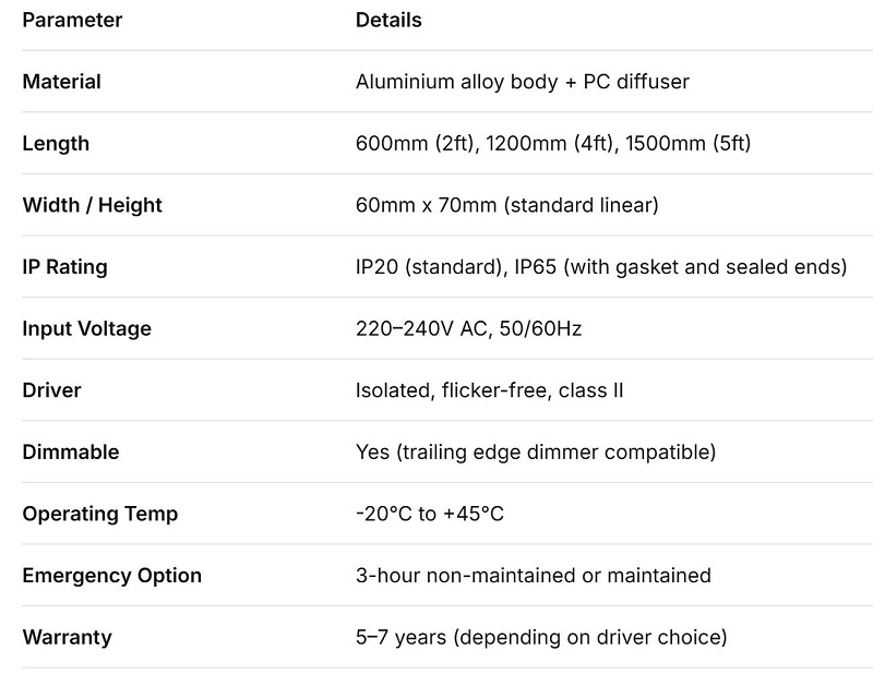 Materiál: Obvykle extrudovaný hliník pro odvod tepla, spárovaný s polykarbonátovým difuzorem. Existují ocelové verze, ale hliník je zlatým standardem pro udržení chladných LED diod.